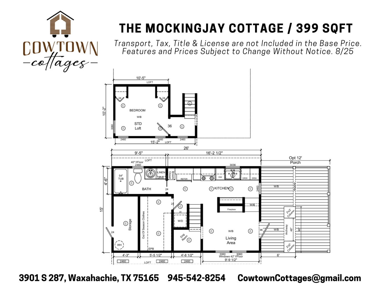 After several years of designing our way into this industry, Kelley has taken the most requested features and designed them into one of the most innovative park models to hit the market. Exclusive to Cowtown Cottages through the Summer of 2024, the details of this new design were masterfully executed by Platinum Cottages. We are super grateful for Platinum's willingness to tackle the conceptual drawings that Kelley designed. Kelley's vision for this home comes from first-hand experience of living in a Cowtown Cottage full-time. This plan boasts of abundant kitchen storage and countertop space, built-in counter-height dining space that could be used as a desk, a built-in dog room for the furry children, a large climate-controlled flex space, exterior storage access, spacious bathroom, and a 9' x 10'5" full-height bedroom in the loft to give you tree top views. This home was designed with empty nesters or single professionals in mind. However, don't dismiss the possibilities of making the climate-controlled flex space and the dog room into fantastic fort-like housing for littles. The possibilities are endless. We hope you will come tour the Mockingjay for yourself. We would love to know your thoughts and the opportunity to design a home just for you!